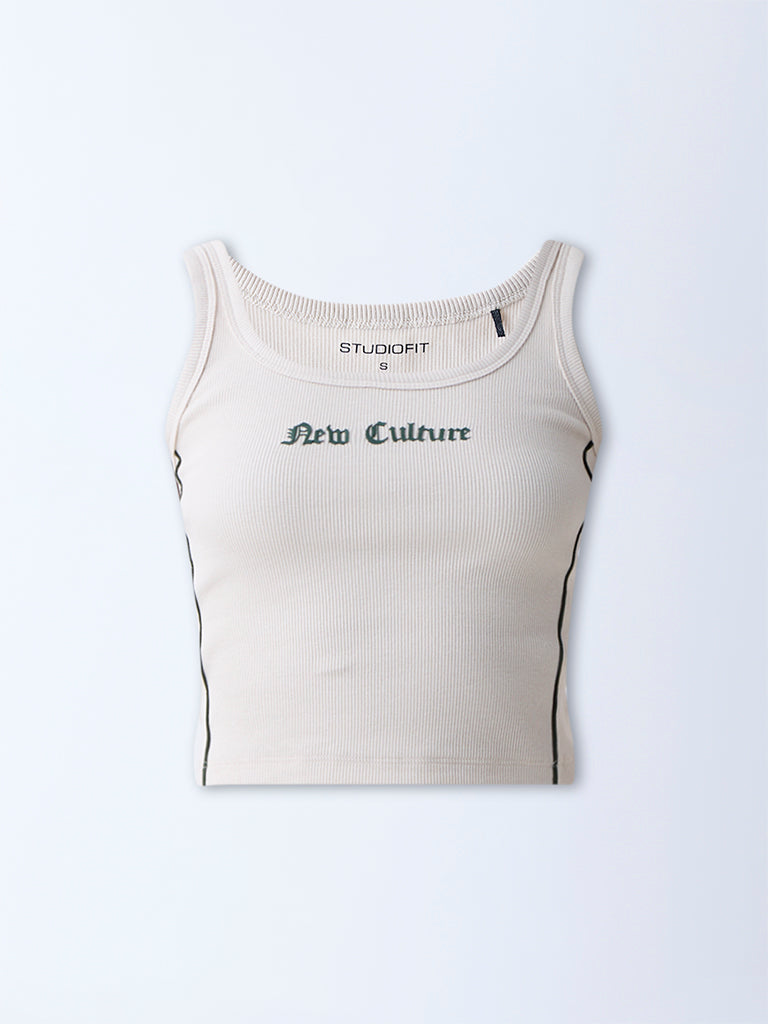 Studiofit Cream Text Design Cotton-Blend Tank Top