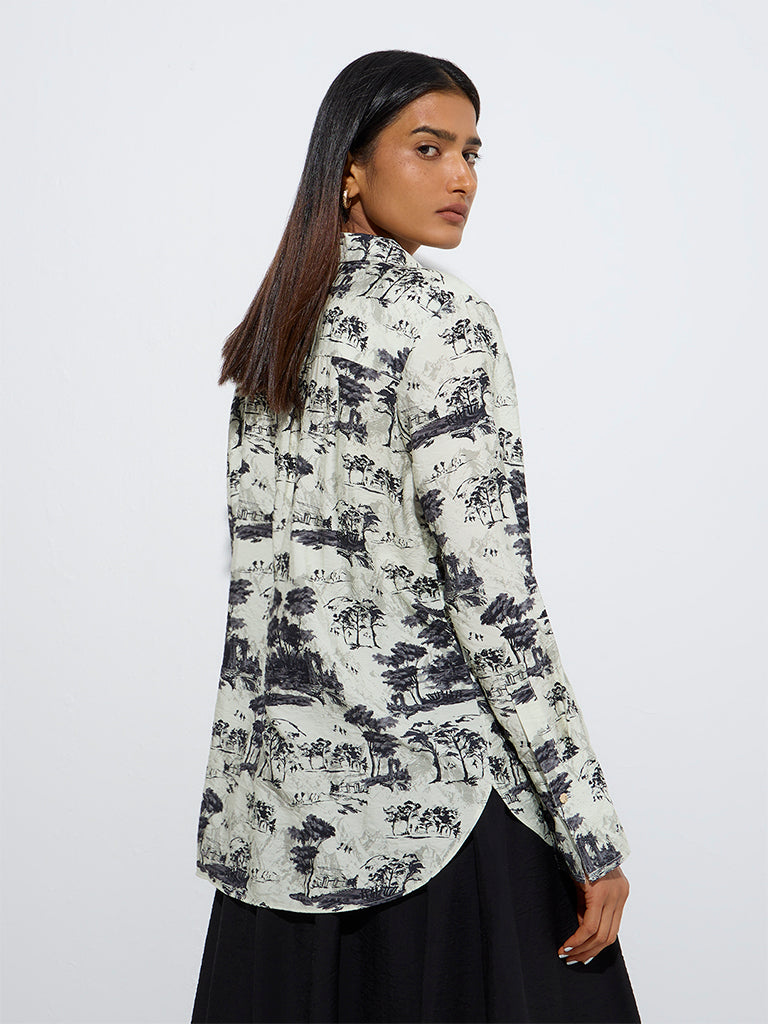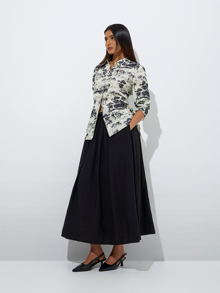 This black shirt from Wardrobe is adorned with nature-inspired prints for an elevated look. Spun from a lightweight fabric, it features a spread collar that flows into a classic button placket, while the full sleeves with buttoned cuffs add a tailored touch to its relaxed silhouette.
