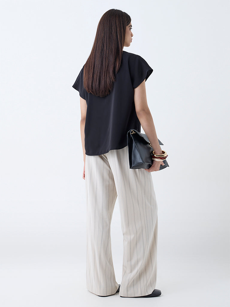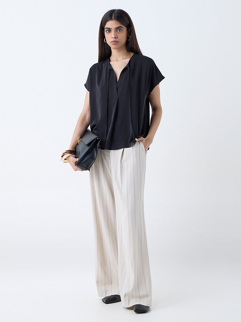 This black top from Wardrobe balances contemporary style with professional poise. Crafted from ultra-lightweight fabric, it drapes fluidly over the silhouette, accentuating ease of movement. The V-neck with a tie-up detail adds a touch of sophistication, while dolman sleeves bring refinement to the overall look.