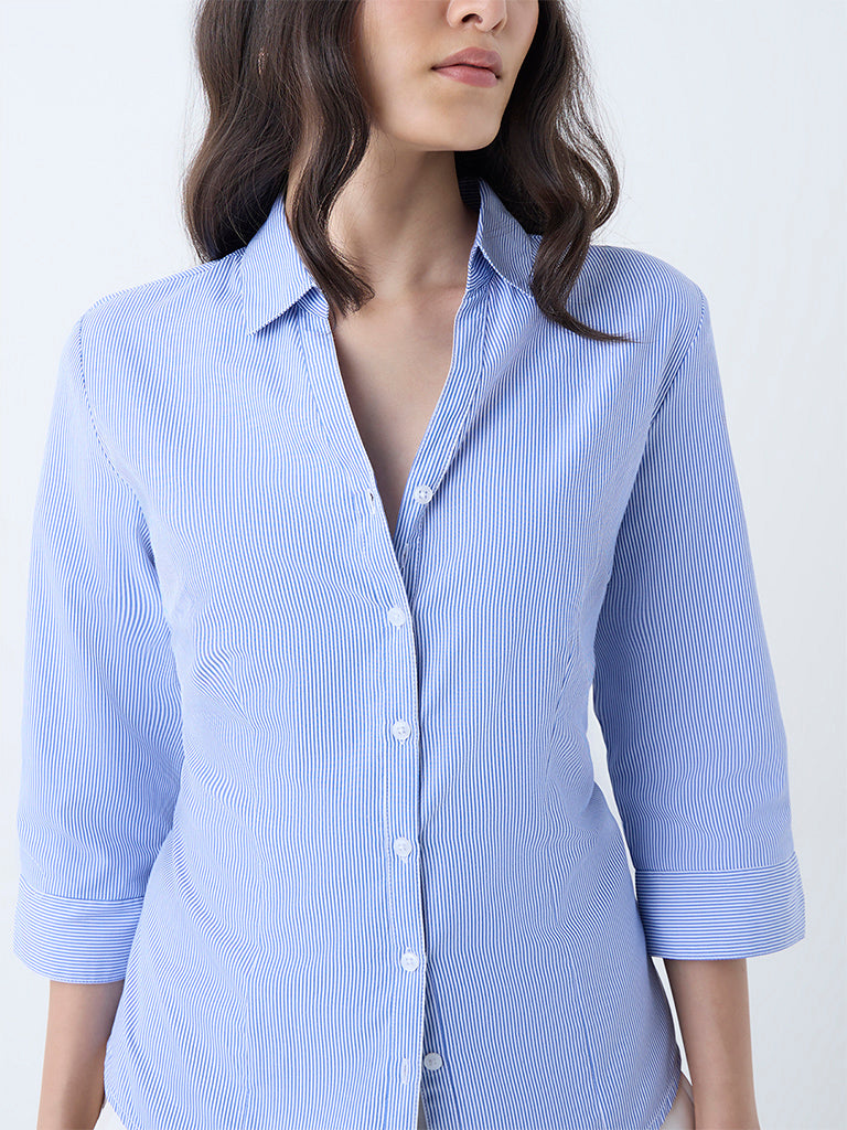 Wardrobe brings modern polish with this blue shirt, designed for a smart-casual finish. Spun from a breathable fabric, it features a sharp shirt collar, a button-up front, and three-quarter sleeves for a tailored look. The classic stripe pattern adds a touch of sophistication, making it ideal for both work and off-duty styling.