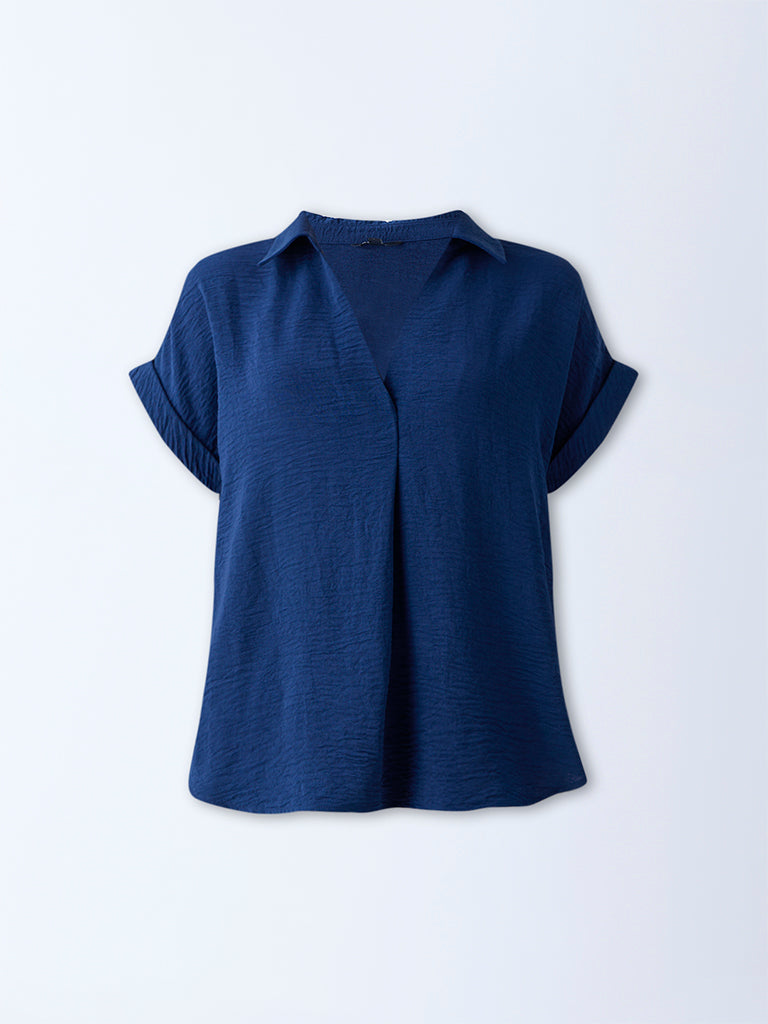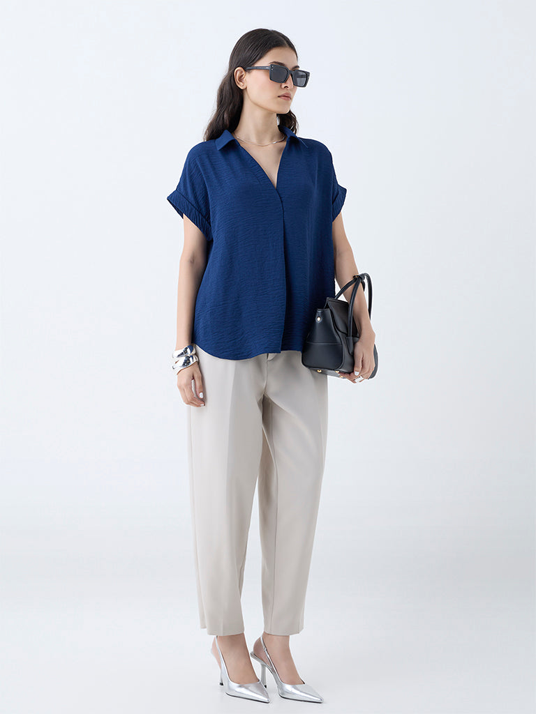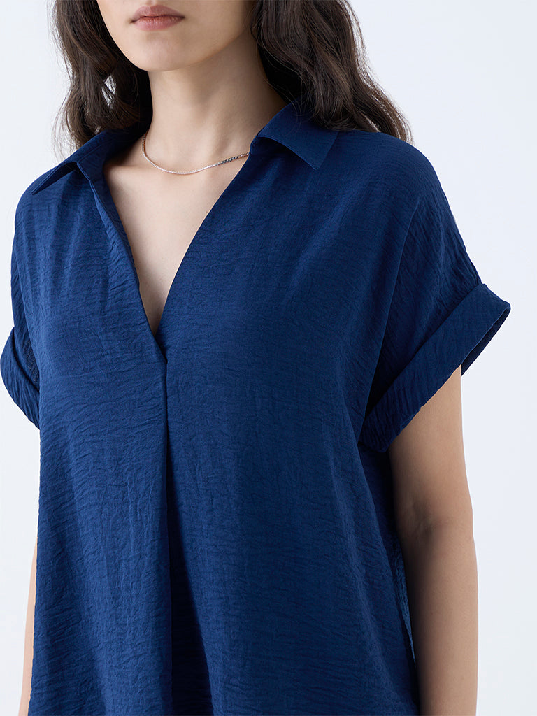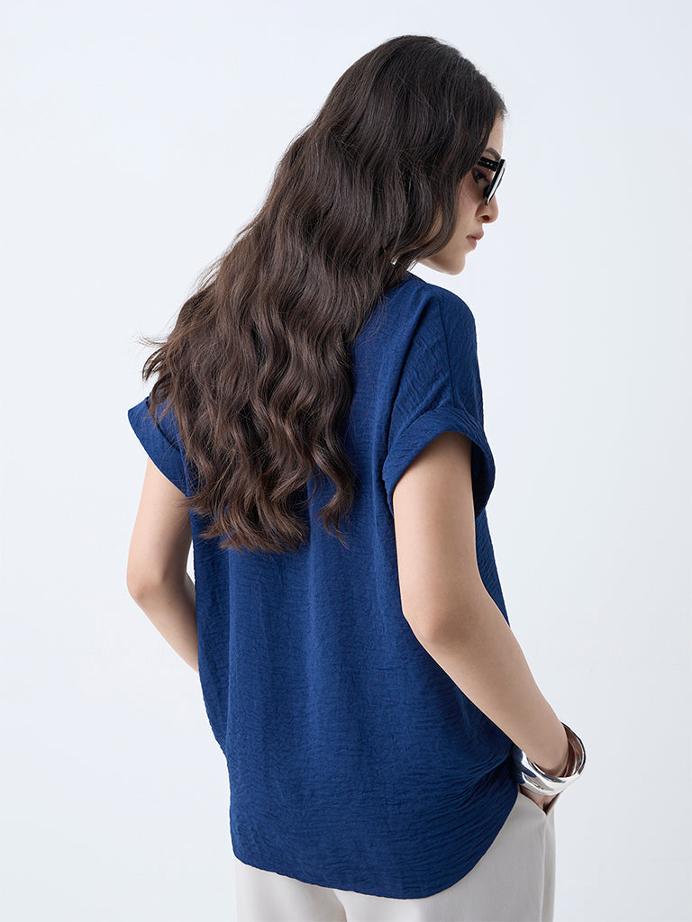 Wardrobe launches this indigo top as a sophisticated choice for contemporary dressing. Made from a crinkle-textured fabric, it is styled with a flattering V-neckline and upturned dolman sleeves for a polished finish.