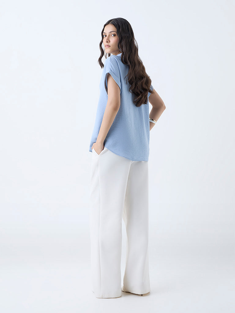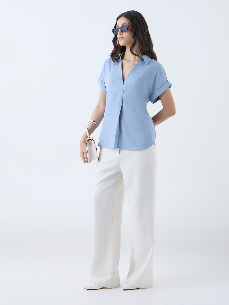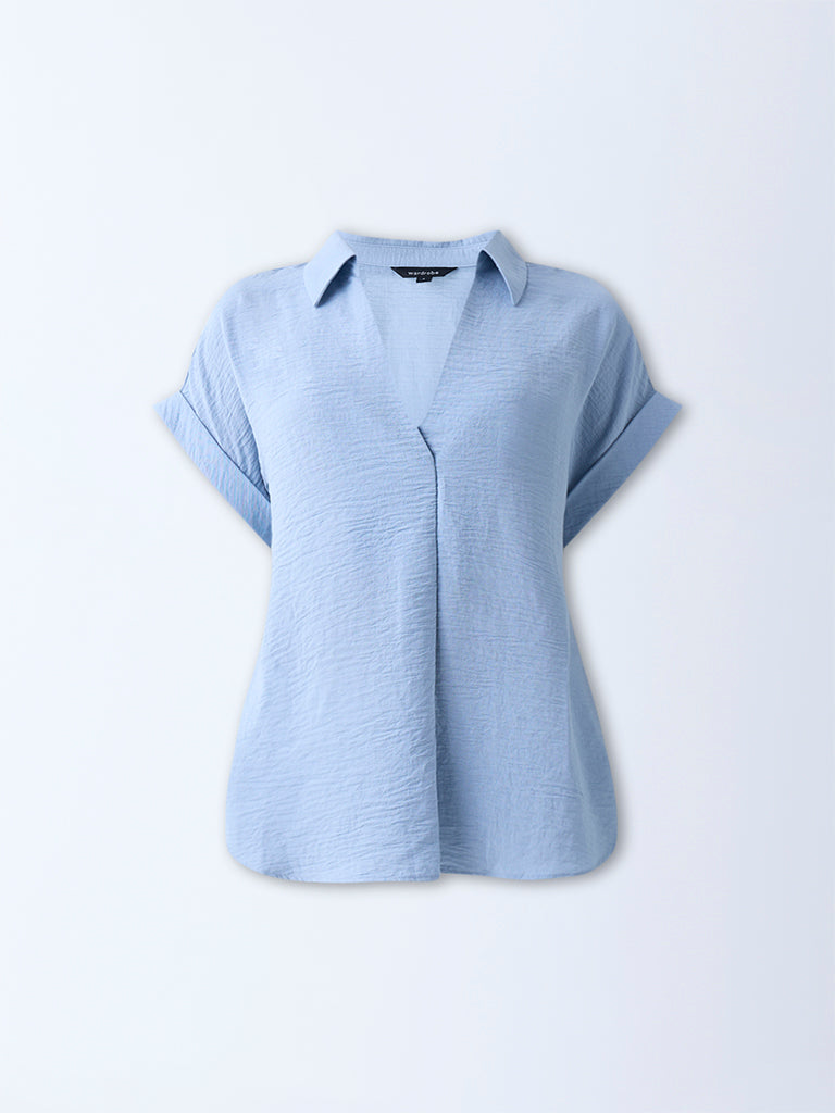 This light blue top from Wardrobe introduces texture to your office repertoire. Framed by a sharp V-neck collar and upturned dolman sleeves, it brings sophisticated finish to tailored ensembles.