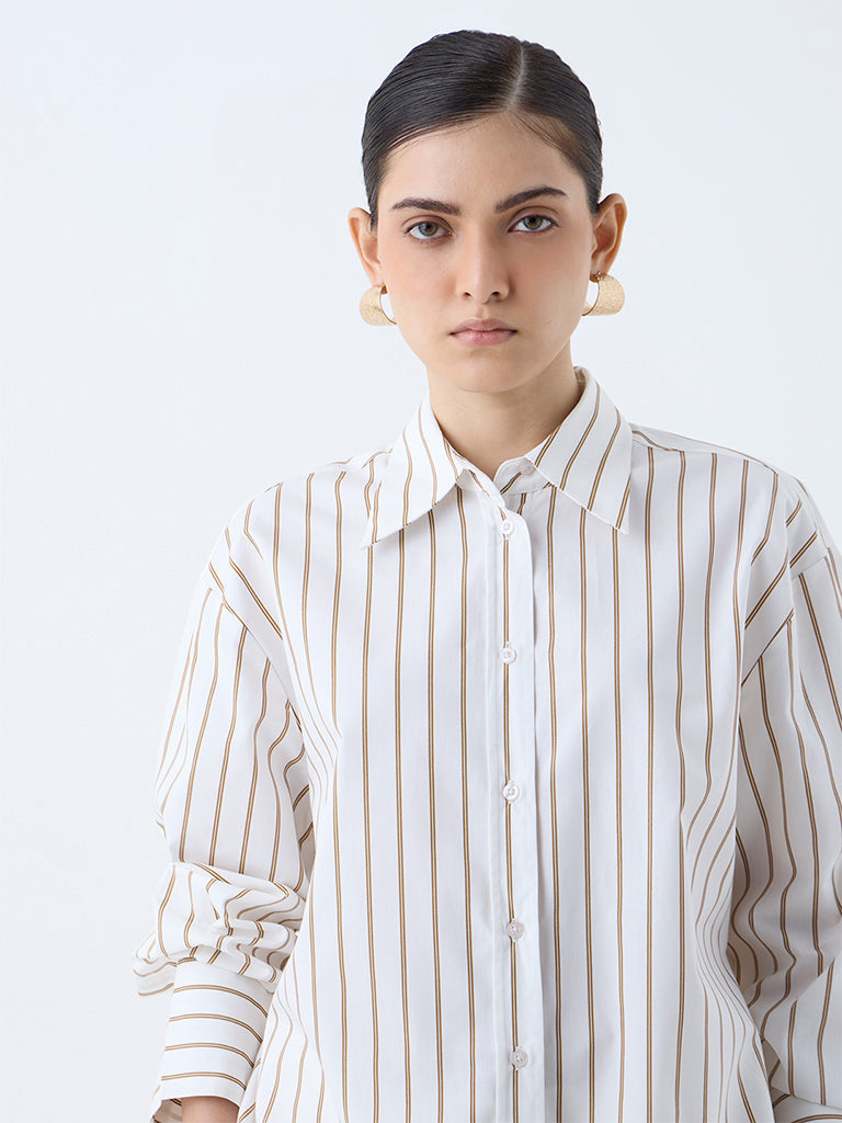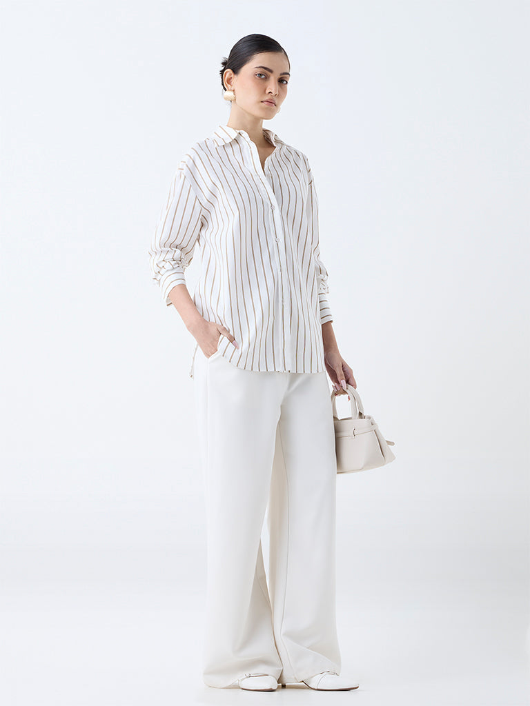 This white shirt from Wardrobe redefines sophistication for the modern woman. Constructed from a lightweight fabric with contrasting stripes, it features a crisp collar, button placket, and full sleeves that create a polished silhouette suited to formal settings.