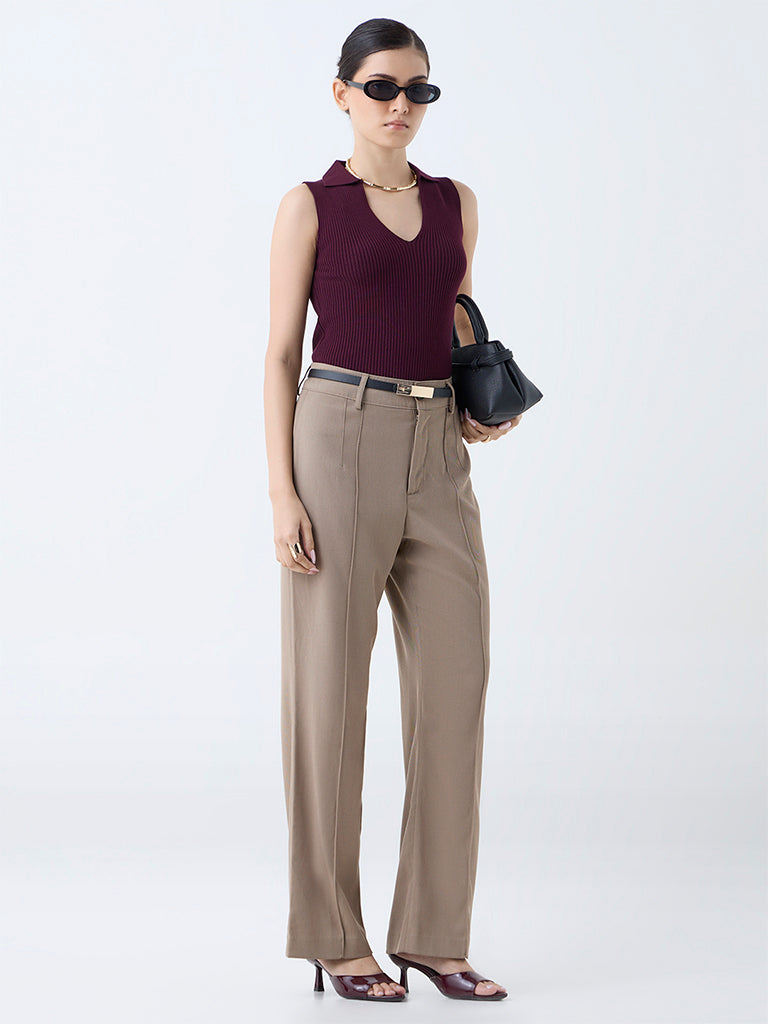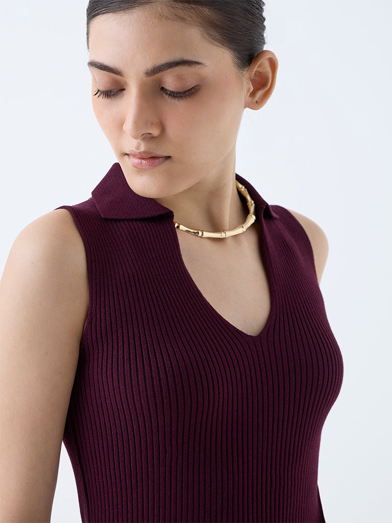 This wine top from Wardrobe is fashioned for the woman who moves effortlessly between boardroom meetings and after-hours charm. Woven in a ribbed-textured fabric, it frames the silhouette with a sleeveless cut and a sharp V-neck collar, striking the perfect balance of polish and ease.