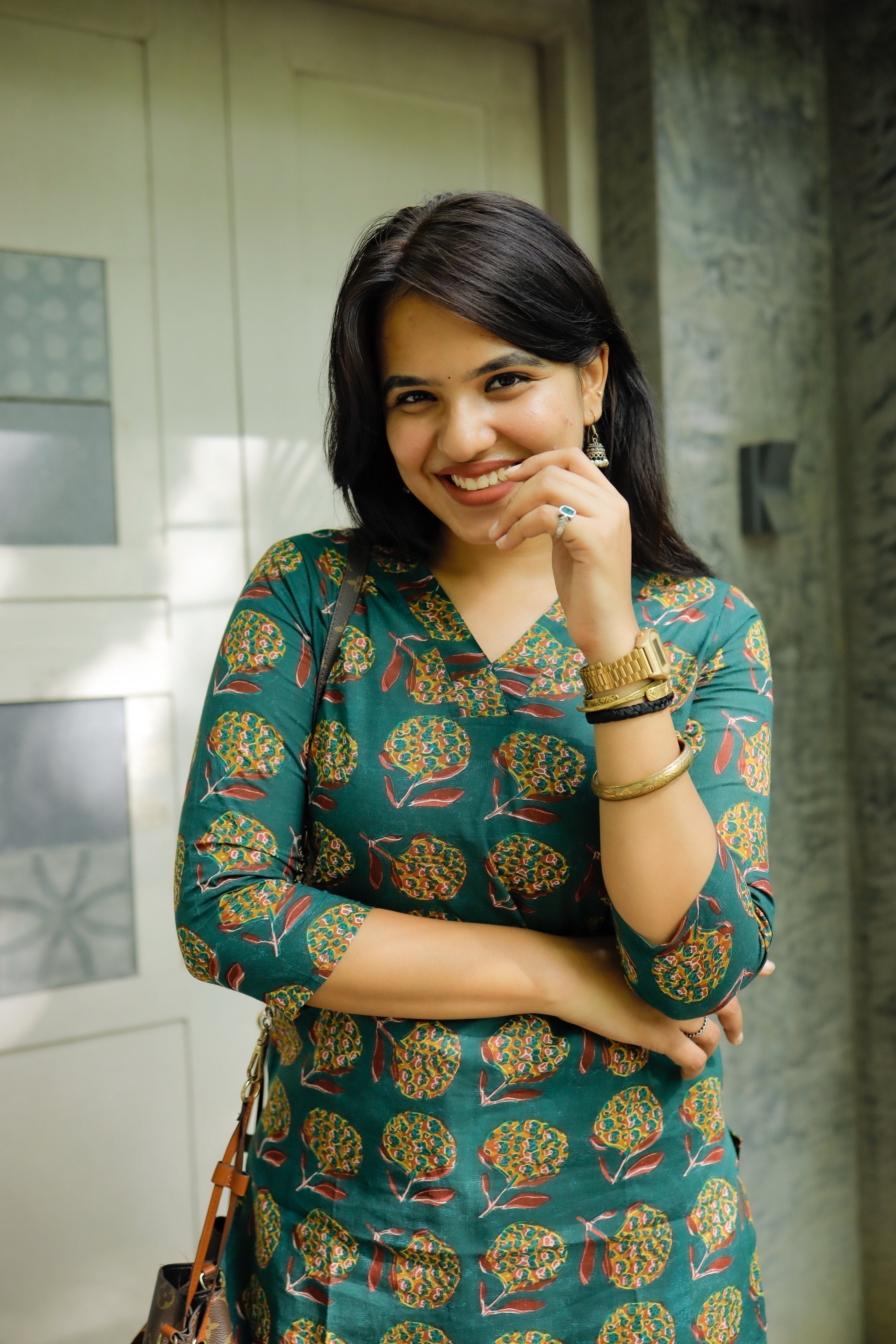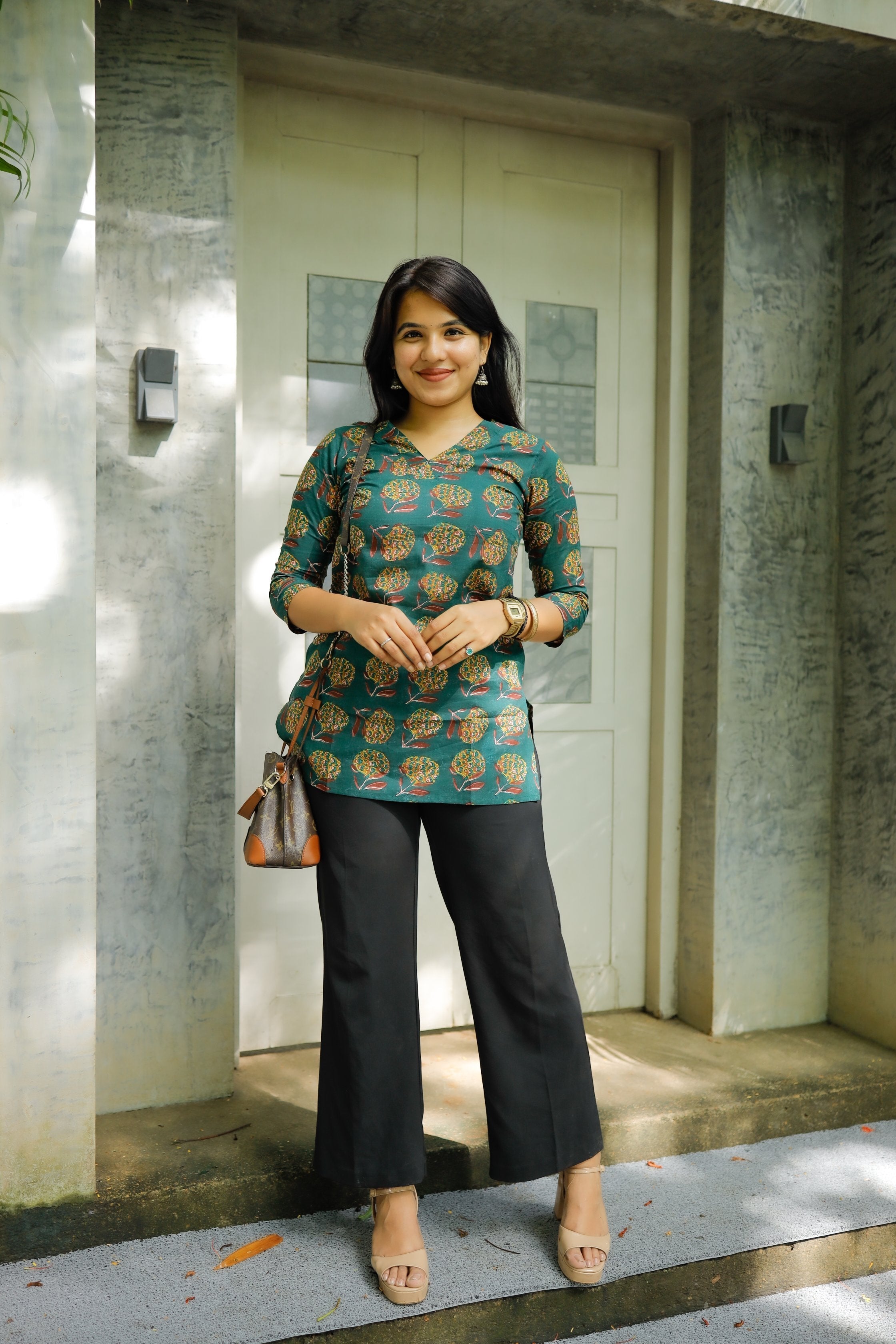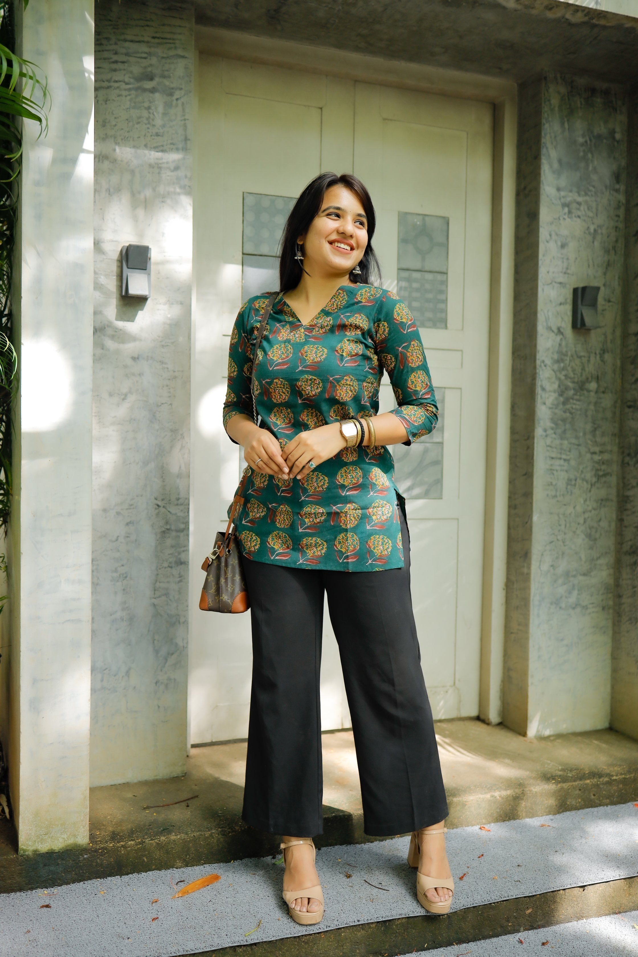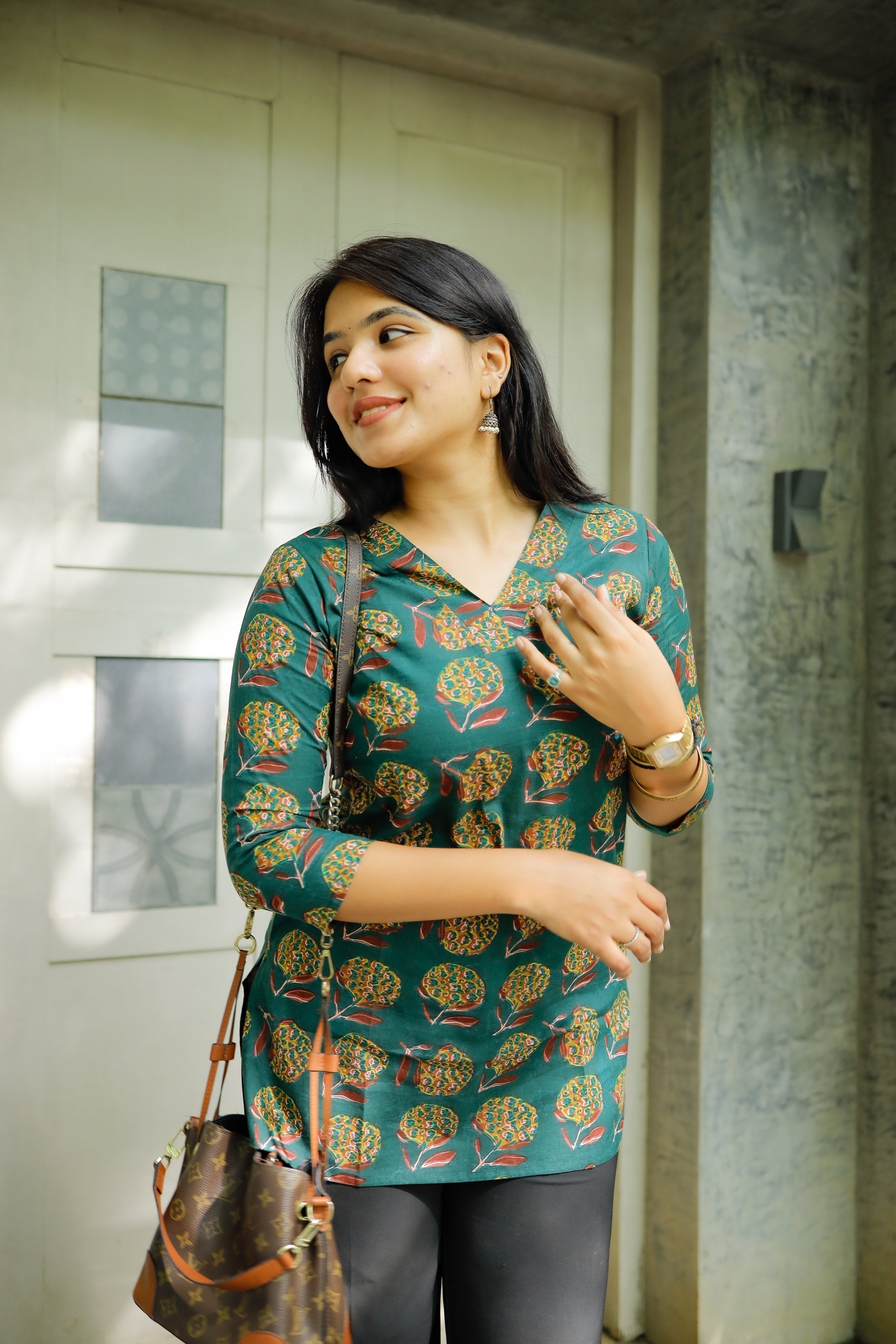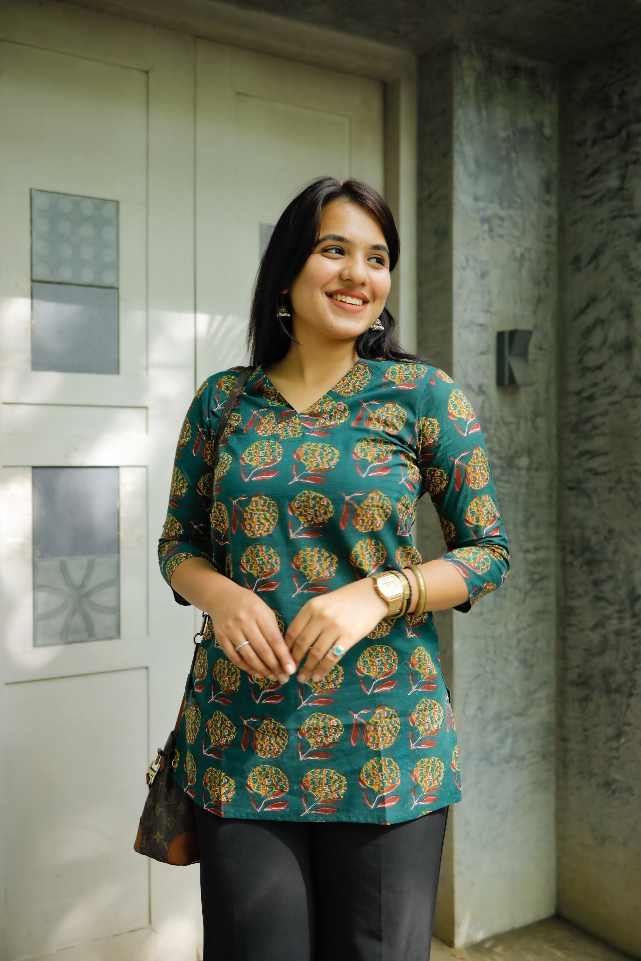 Comfy and super chic cotton short kurti in classy and cute prints with smart neck and sleeve pattern. Perfect to pair it with jeans / culottes / trousers. Organic cotton is used making it the most apt for this summer. Perfect office / college wear Color : Dark Green Fit...