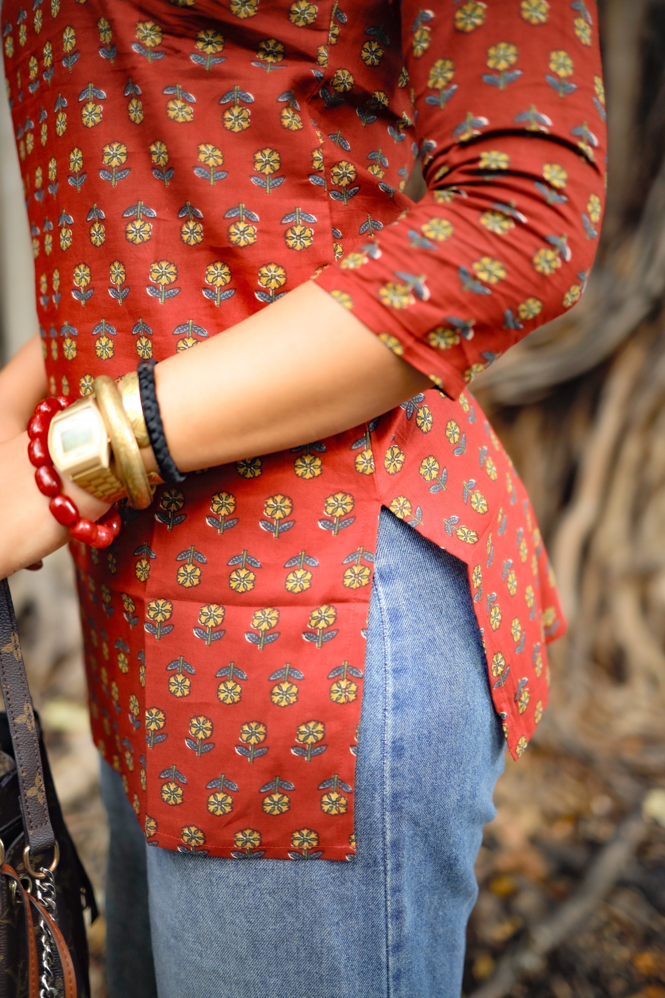 Comfy and super chic cotton short kurti in classy and cute prints with smart neck and sleeve pattern. Perfect to pair it with jeans / culottes / trousers. Organic cotton is used making it the most apt for this summer.