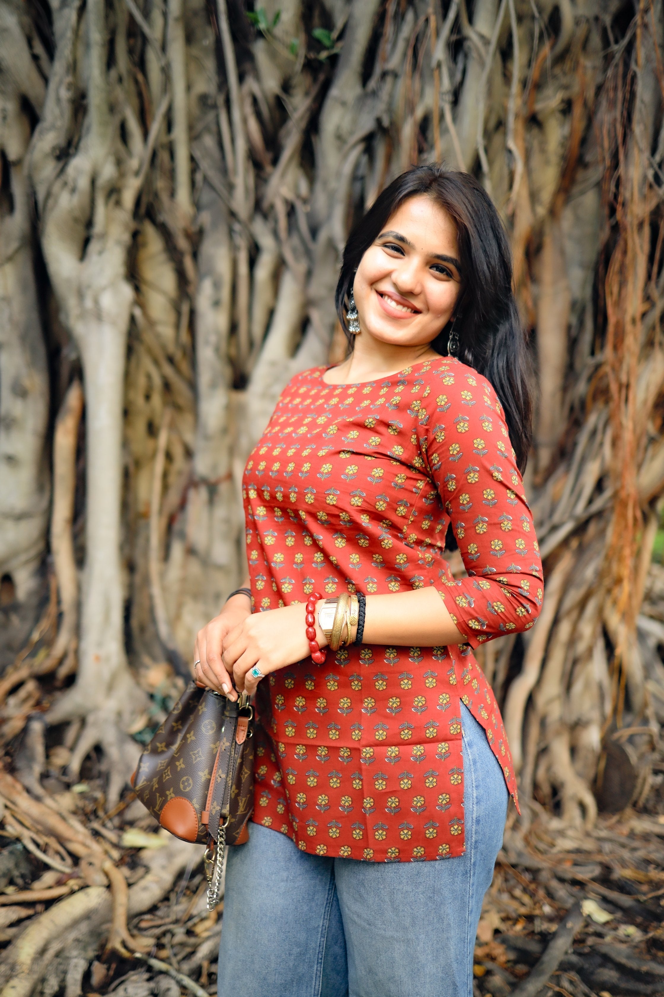 Comfy and super chic cotton short kurti in classy and cute prints with smart neck and sleeve pattern. Perfect to pair it with jeans / culottes / trousers. Organic cotton is used making it the most apt for this summer. Perfect office / college wear Color : Red Fit :...