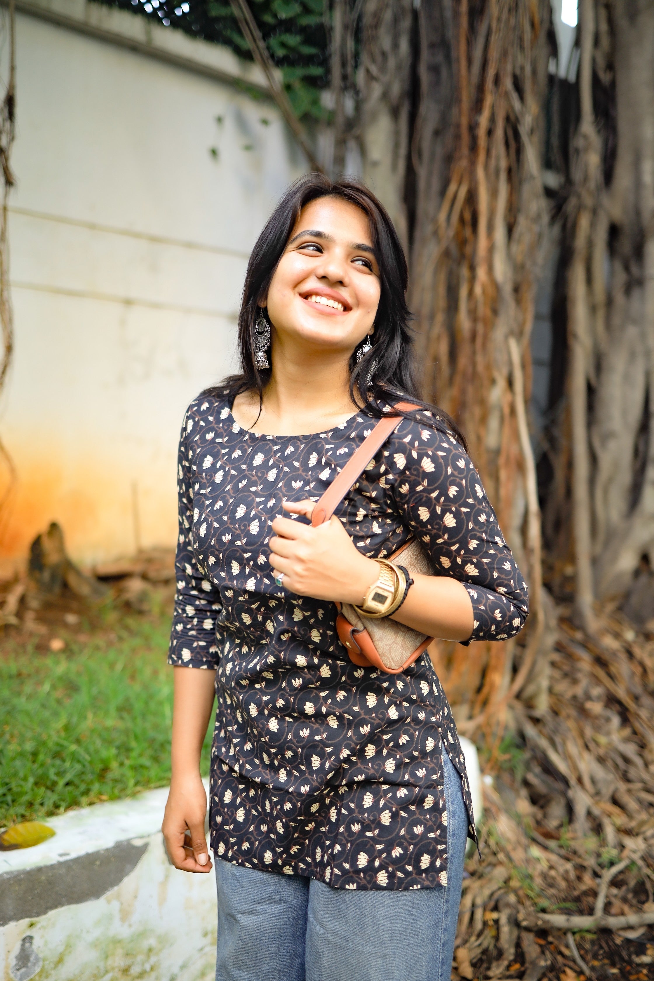 Comfy and super chic cotton short kurti in classy and cute prints with smart neck and sleeve pattern. Perfect to pair it with jeans / culottes / trousers. Organic cotton is used making it the most apt for this summer. Perfect office / college wear Colour : Black Fit :...