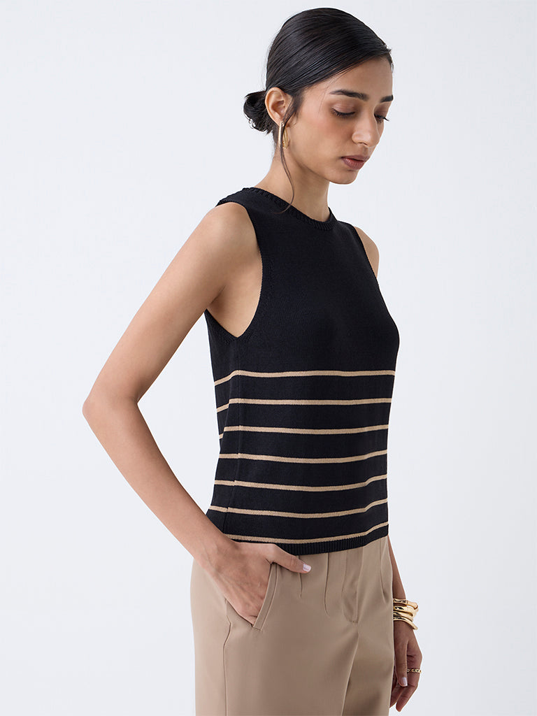 This black striped top from Wardrobe redefines casual sophistication. Woven from a knit-textured fabric, it features a classic crew neck and sleeveless cut, allowing effortless layering or solo styling.