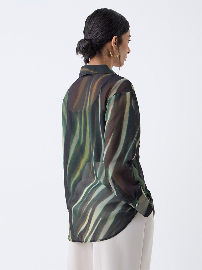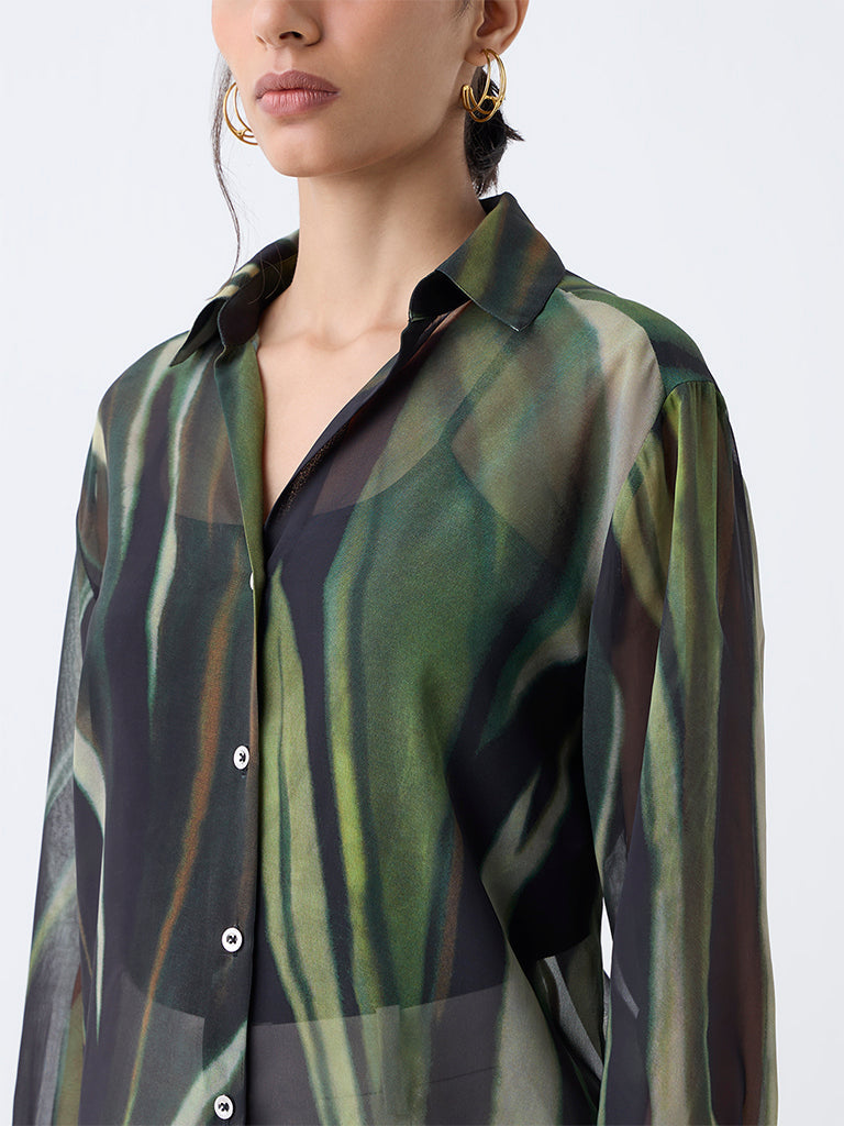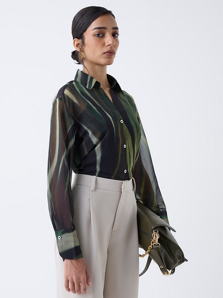 Elevate your office repertoire with this fluid olive shirt from Wardrobe. Woven from a self-textured fabric, it drapes gracefully, offering a relaxed silhouette. The classic collar flows into a sleek button placket, while full sleeves provide structure and balance.